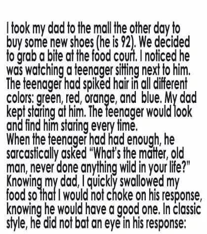 We decided to grab a bite at the food court. I noticed he was watching a teenager sitting next to him. The teenager had spiked hair in all different colors: green, red, orange, and blue. My dad kept staring at him. The teenager would look and find him staring every time.